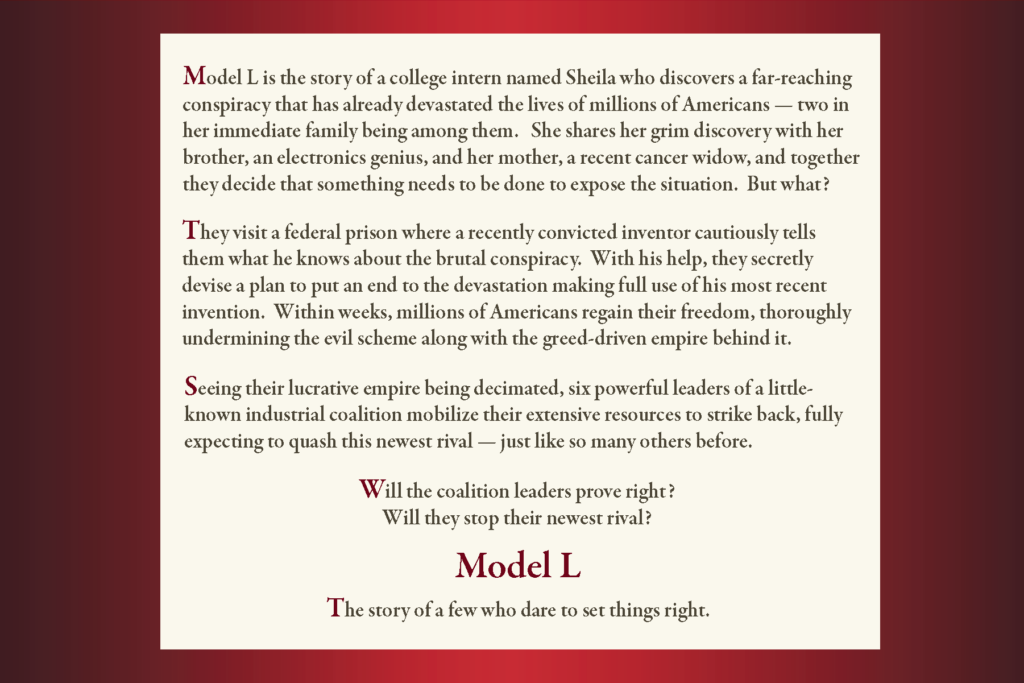 Model L, a fiction novel by Robert Devereux, was completed in 2006, but due to family health difficulties was never properly released to the public. We hope you’ll find Model L both enjoyable and inspiring.